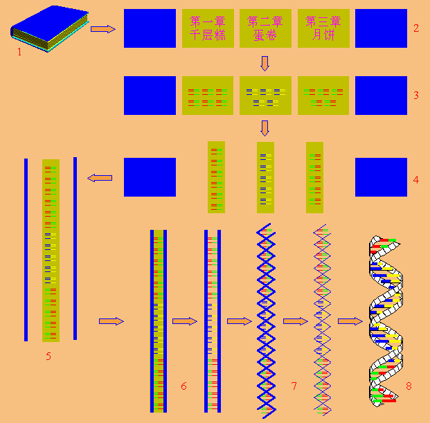 由于人们一般上都知道DNA与生命的遗传密码(Genetic Code)有关,因此,要说明DNA是什么,我们不妨从密码着手。让我们通过以下的想像例子,将一本书密码化!